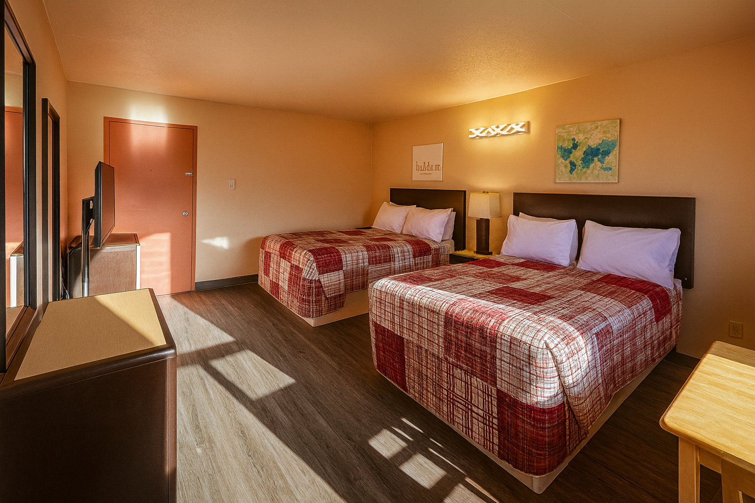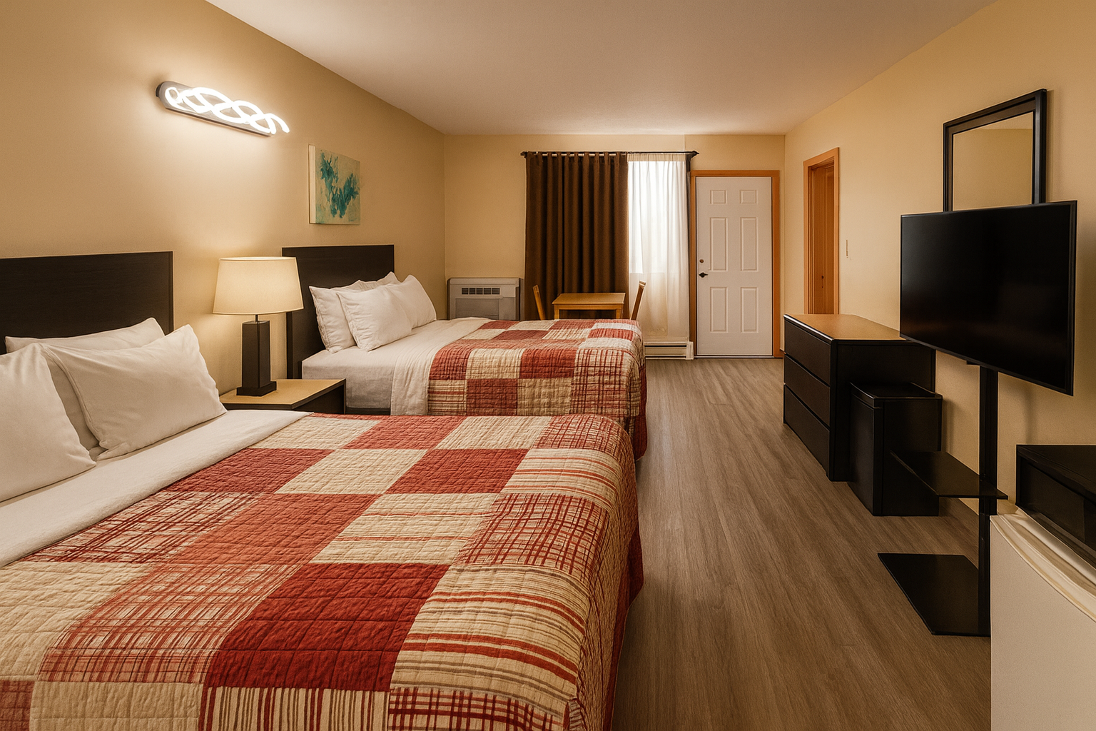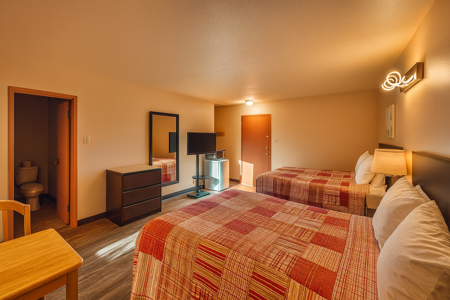 Également équipée d’un téléviseur à écran plat, d’une petite table et deux chaises, d’un air climatisé individuel et d’un petit réfrigérateur.